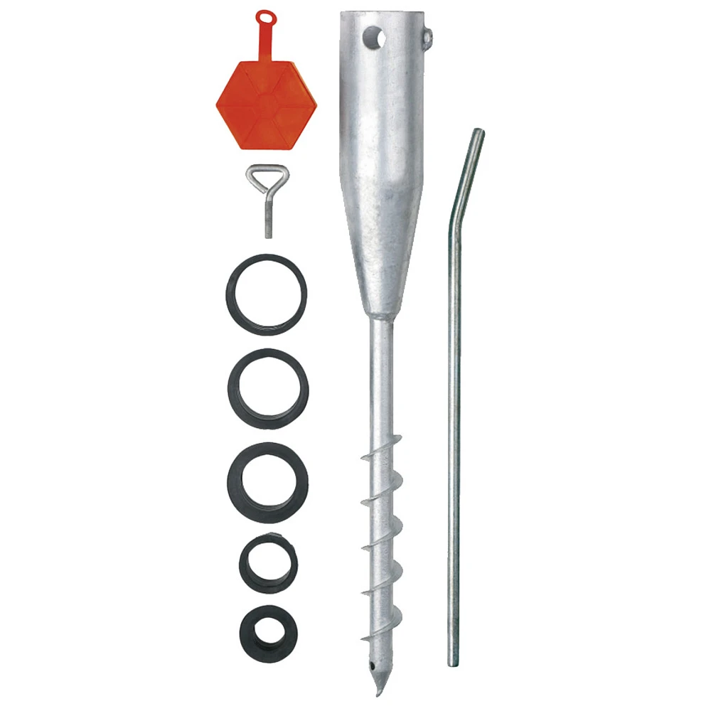 Befestigen ohne Beton. Bodendübel aus Metall mit Eindrehstange, zum Versenken im Erdreich. 9-teiliges Set mit 5 verschiedenen Adaptern für Durchmesser 24, 38, 42, 50, 55, 65 cm.