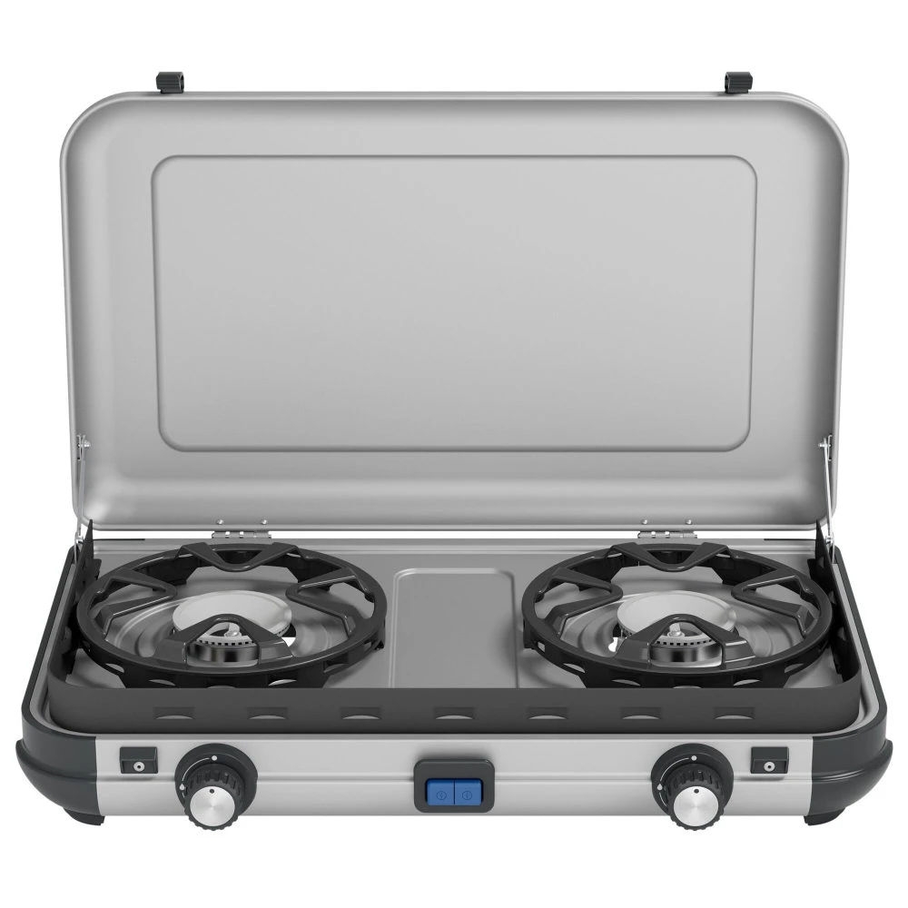 Die Camping Kitchen 2 ist der perfekte Kocher für jeden Familienausflug, sei es für ein spontanes Wochenende oder für einen längeren Ausflug. Es ist ein leichter und einfach zu transportierender Kocher mit zwei Brennern. Das kompakte Design mit eingebauten Tragegriffen ermöglicht ein platzsparendes Verstauen im Auto oder dem Wohnmobil. Weiterhin hat der Kocher hitzeresistente Topfhalter aus emailliertem Stahl, die zusätzlich als Windschutz dienen. Die einfache Abnahme der Topfhalter ermöglicht ein schnelles und einfaches Säubern.
