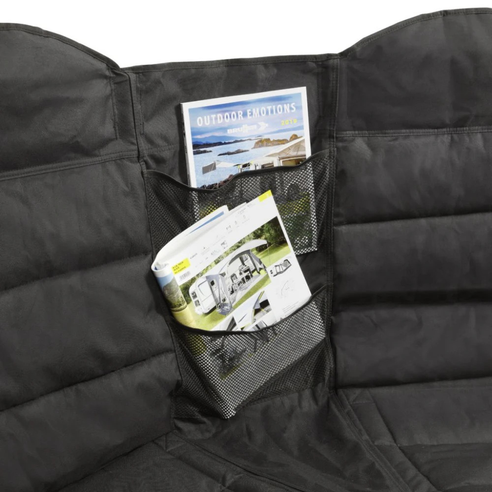 Sehr komfortables 2 Personen-Sofa mit leicht angewinkeltem Faltgestell. Ideal um den Vorraum von Zelten oder Vorzelten entspannt zu genießen. Das Sofa ist mit einem zentral angebrachten Organizer und breiten Armlehnen inklusive Getränkehaltern ausgestattet. Bequem gepolsterter Sitz- und Rückenbereich. Sekundenschneller Auf- und Abbau ohne spezielle Montage. Das kompakte Packmaß ermöglicht eine leichtes Verstauen. Inklusive Packsack für Aufbewahrung und leichten Transport.