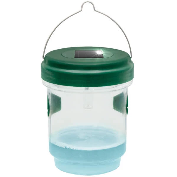 Füllen Sie als Flüssigkeit einen Mix aus Essig und Zuckerwasser in den Becher. Durch den süßlichen Duft werden Wespen in die Falle gelockt, die besondere Bauweise lässt kaum ein Entkommen mehr zu. Zum Einbruch der Dunkelheit schaltet sich automatisch eine blaue LED ein, welche die Flüssigkeit blau schimmern lässt. Dieser Effekt zieht Insekten an, welche dann ebenfalls mit der Flüssigkeit gefangen werden.